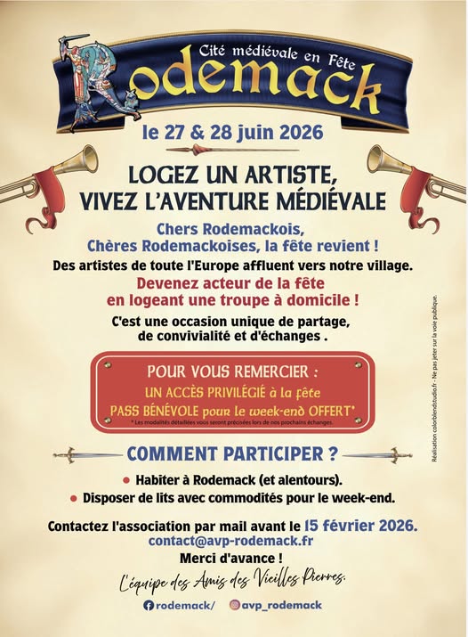 Pour l’édition 2026 de Rodemack Cité médéviale en Fête (27 et 28 juin) l’AVP recherche des hôtes accueillants pour loger les artistes.
